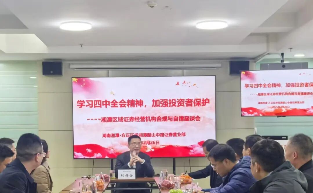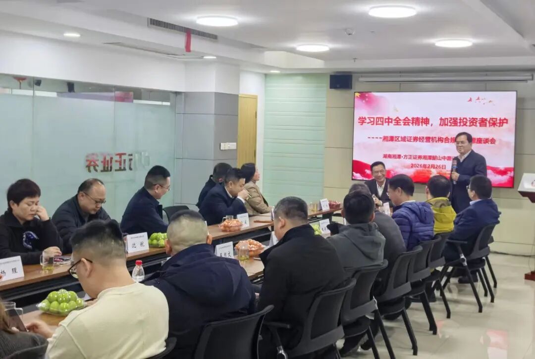 马年伊始,万象启新。为深入学习贯彻党的二十届四中全会精神,积极落实吴清主席在中国证券业协会第八届会员大会上的讲话要求,精准锚定“十五五” 时期资本市场高质量发展核心目标,切实将行业使命责任转化为推动区域证券经营机构规范发展的实际效能,2026 年 2 月 26 日,协会紧扣 “打造一流投资银行和投资机构,更好助推资本市场高质量发展” 核心主题,在方正证券湘潭韶山中路营业部组织召开湘潭区域证券经营机构合规与自律工作座谈会。湘潭区域 17 家证券营业部负责人及合规相关工作人员齐聚一堂,共同学习四中全会精神,聚焦行业发展与自律管理工作深入研讨,凝聚行业发展共识,为新一年湘潭区域证券行业高质量发展筑牢合规根基、汇聚龙马奋进之力。