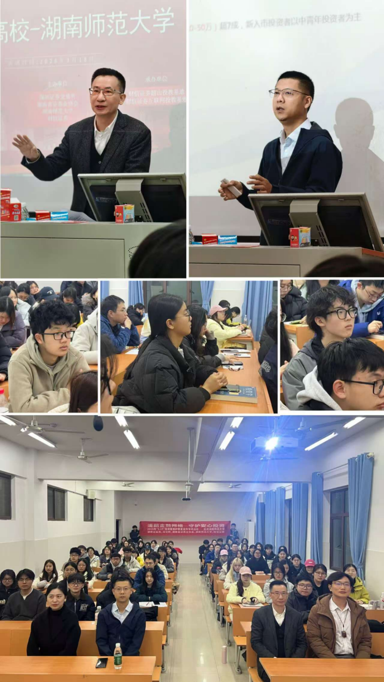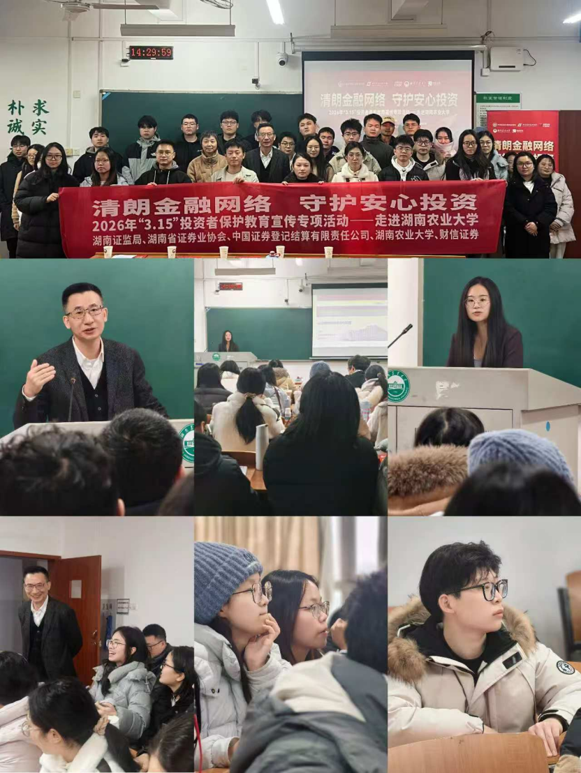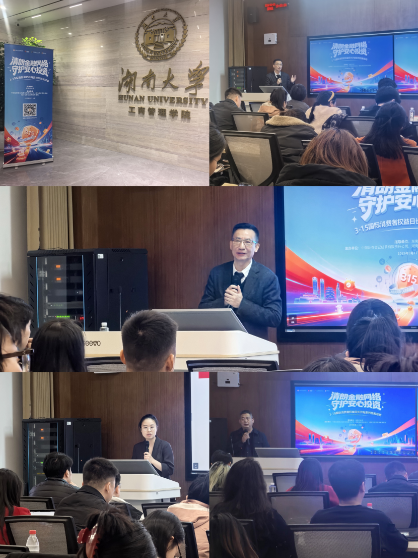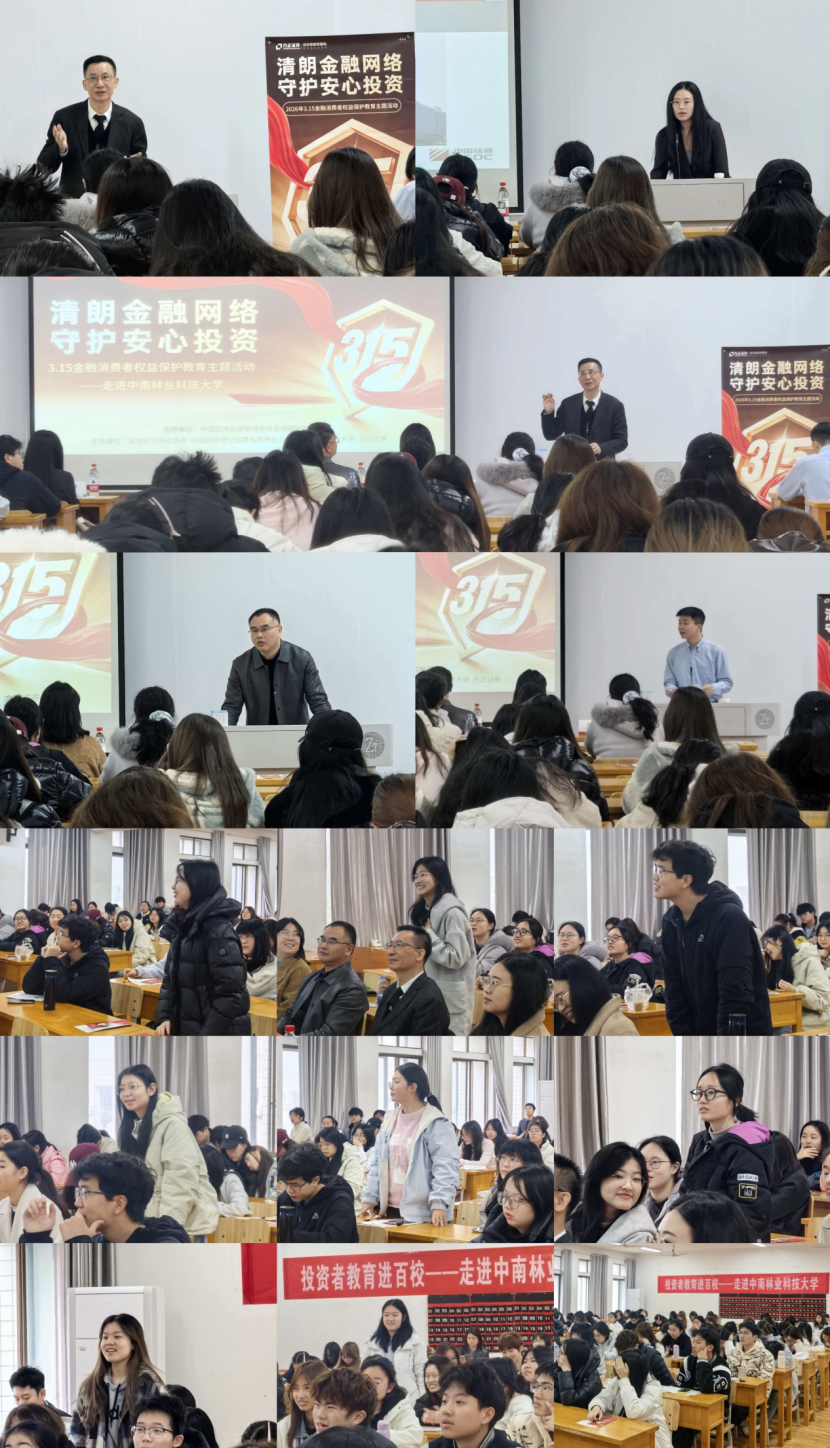 走进湖南大学、湖南师范大学、长沙理工大学、湖南农业大学、中南林业科技大学等高校,开展3.15主题宣讲。邀请交易所、中国结算以及协会专家老师,系统讲授多层次资本市场、证券登记结算、理性投资、风险防范、非法金融识别等知识,引导青年学子树立正确财富观、投资观、风险观,系好资本市场“第一粒扣子”,为资本市场高质量发展储备可靠的青年力量。